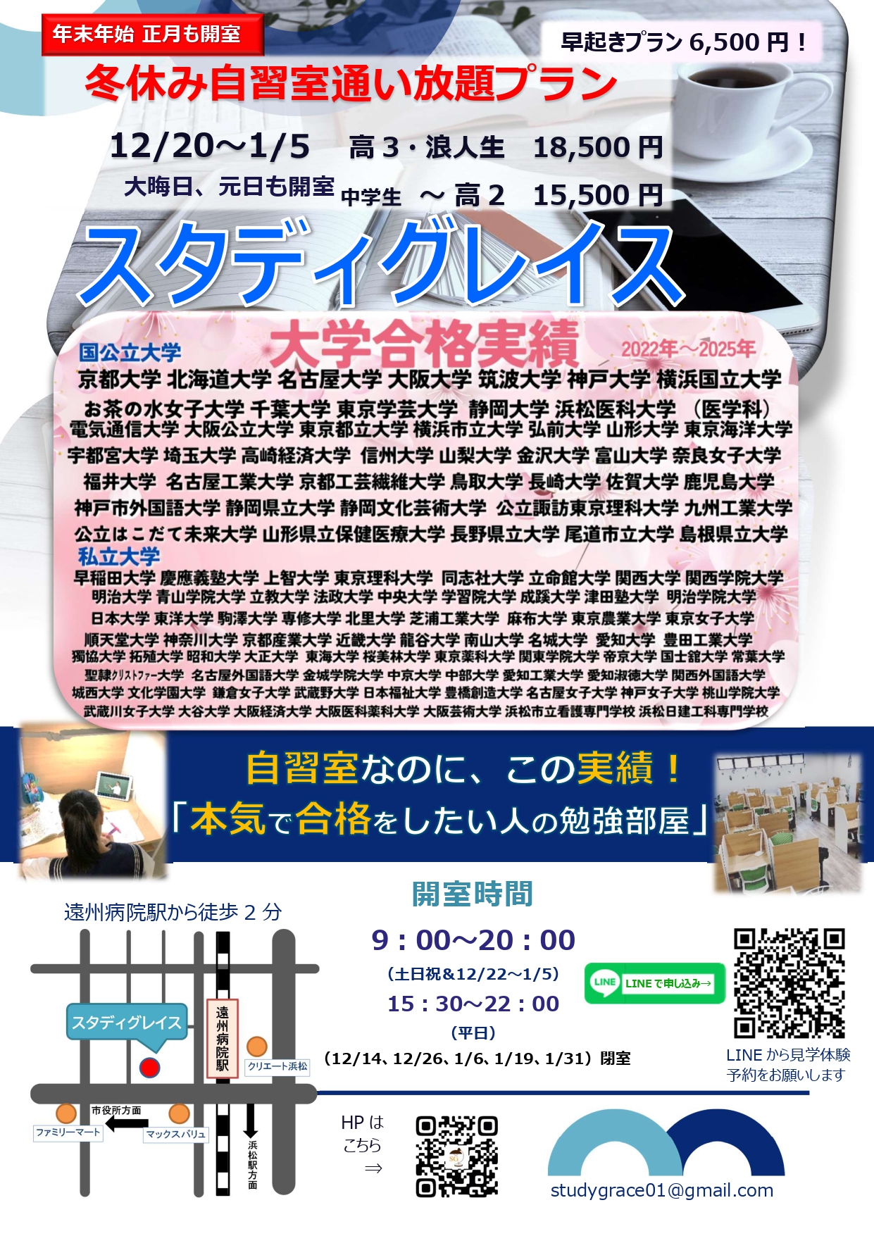 冬休み自習室通い放題プラン募集(浜松館のみ) 下のLINEからのみの受付となります。